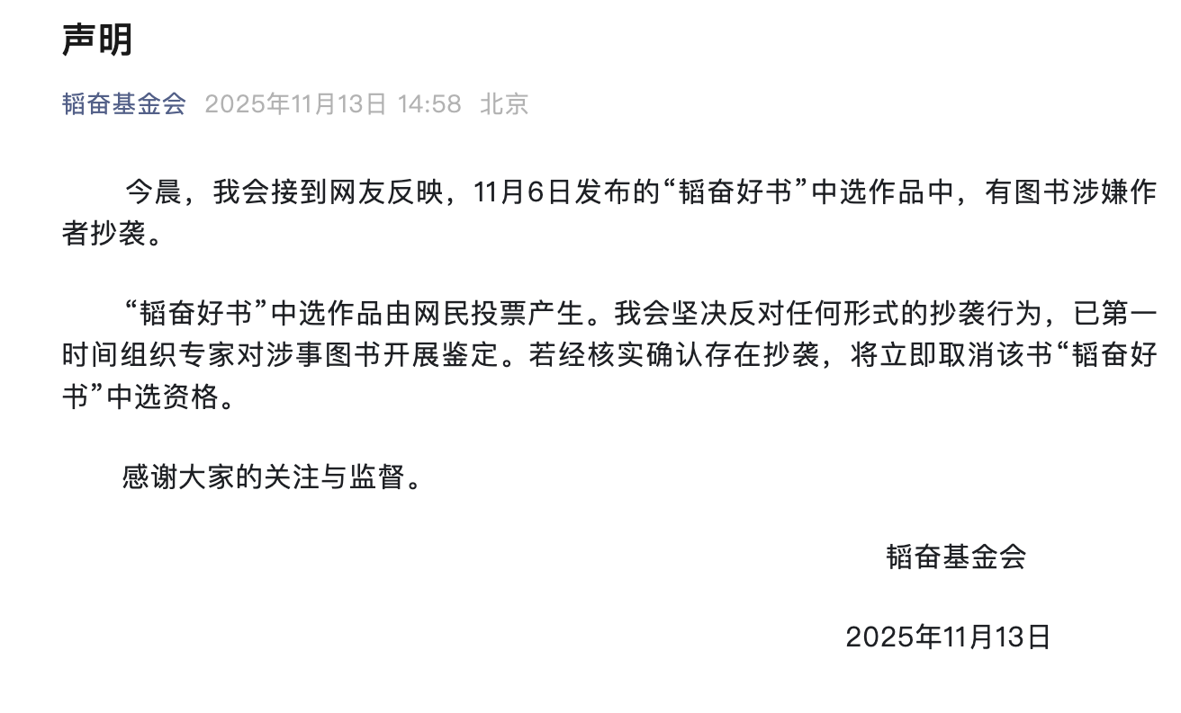 11月13日,韬奋基金会发布声明:今晨接到网友反映,11月6日发布的“韬奋好书”中选作品中,有图书涉嫌作者抄袭。“韬奋好书”中选作品由网民投票产生。基金会坚决反对任何形式的抄袭行为,已第一时间组织专家对涉事图书开展鉴定。若经核实确认存在抄袭,将立即取消该书“韬奋好书”中选资格。